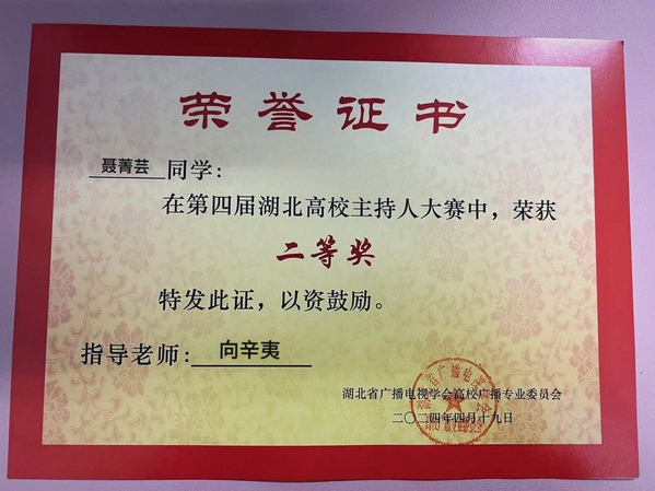 本网讯(通讯员 张慧萍)4月19日,第四届湖北省高校主持人大赛在湖北经济学院大学生活动中心举行。如意体育(中国)广播台播音员、人文学部中文2306班聂菁芸同学在比赛中荣获二等奖。