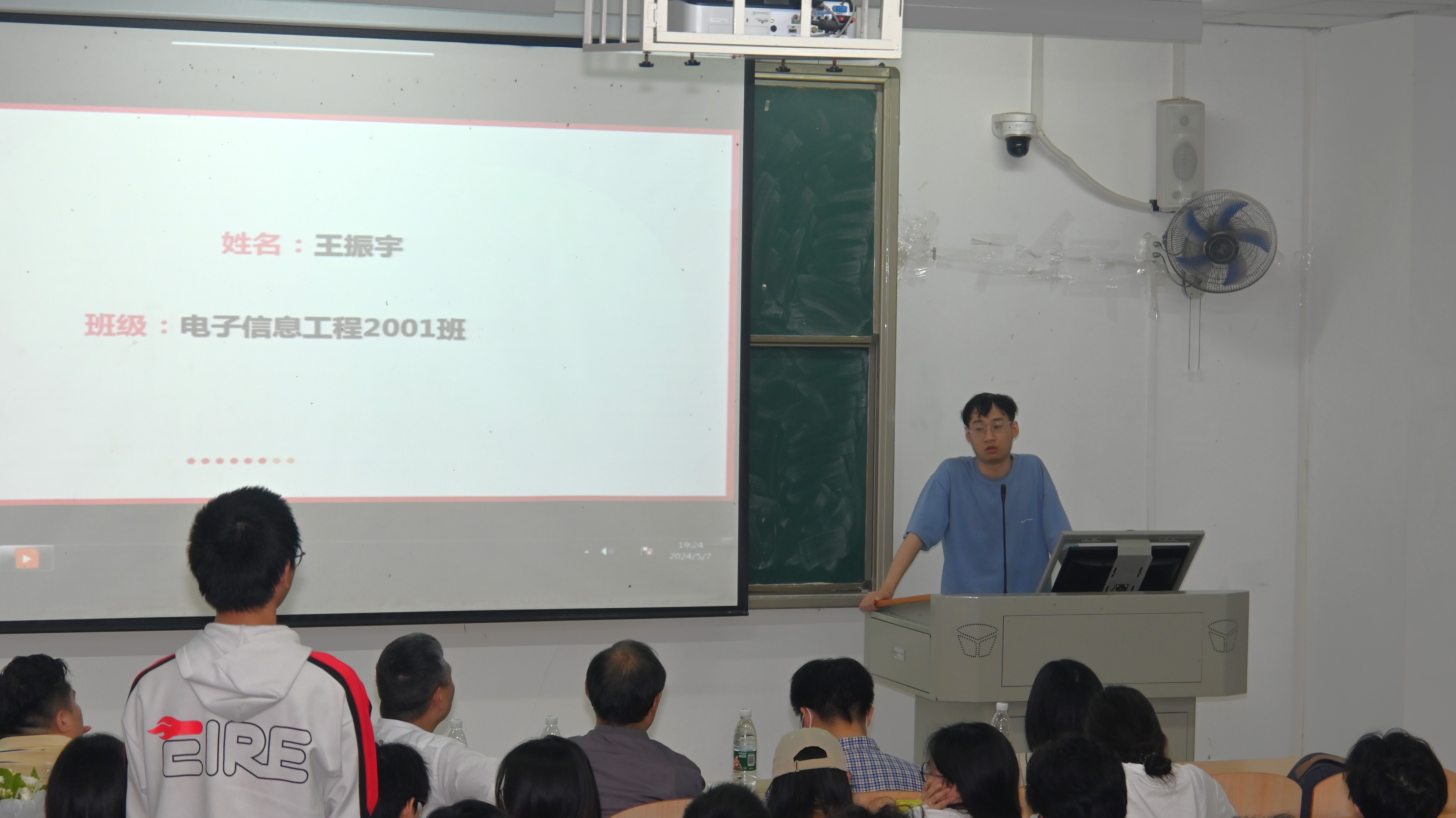 电子信息工程2001班王振宇同学,有着在腾讯、快手等互联网头部企业丰富的实习经历,他讲到自己从加入器乐社就开始寻找市场,后来就业面试成功应聘到腾讯视频号岗位,详实地叙述在了解市场中确定目标,在竞赛中获得实践经验,在读书中提升能力。他强调,学历固然重要,但是在自己心目中,只要今天的我比昨天的我有进步就足够了,经年累月,几年之后再回头看,变化将是巨大的。