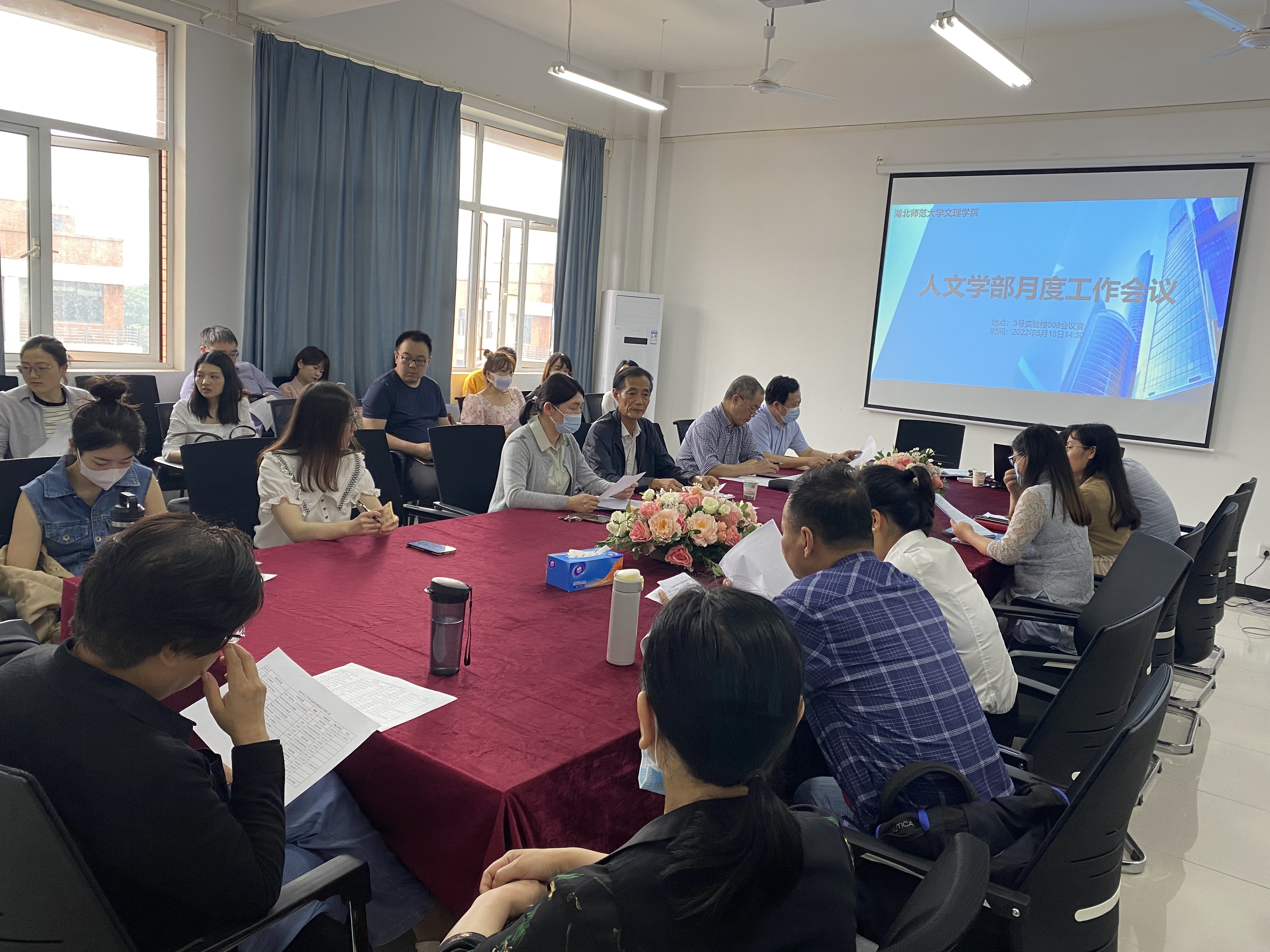 2022年5月18日下午两点半,人文学部在3号实验楼508会议室召开了5月份人文学部全体教职工工作会议,参与此次会议的有人文学部主任熊子延、学部党总支副书记汪玉宝以及人文学部全体教职工。