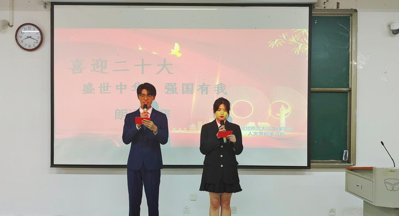9月15日晚,人文学部学习部于教学楼1B101成功举办了以“喜迎二十大,盛世中华,强国有我”为主题的朗诵比赛。其旨在弘扬爱党爱国精神,习近平重要讲话的精神,传递红色积极正能量。