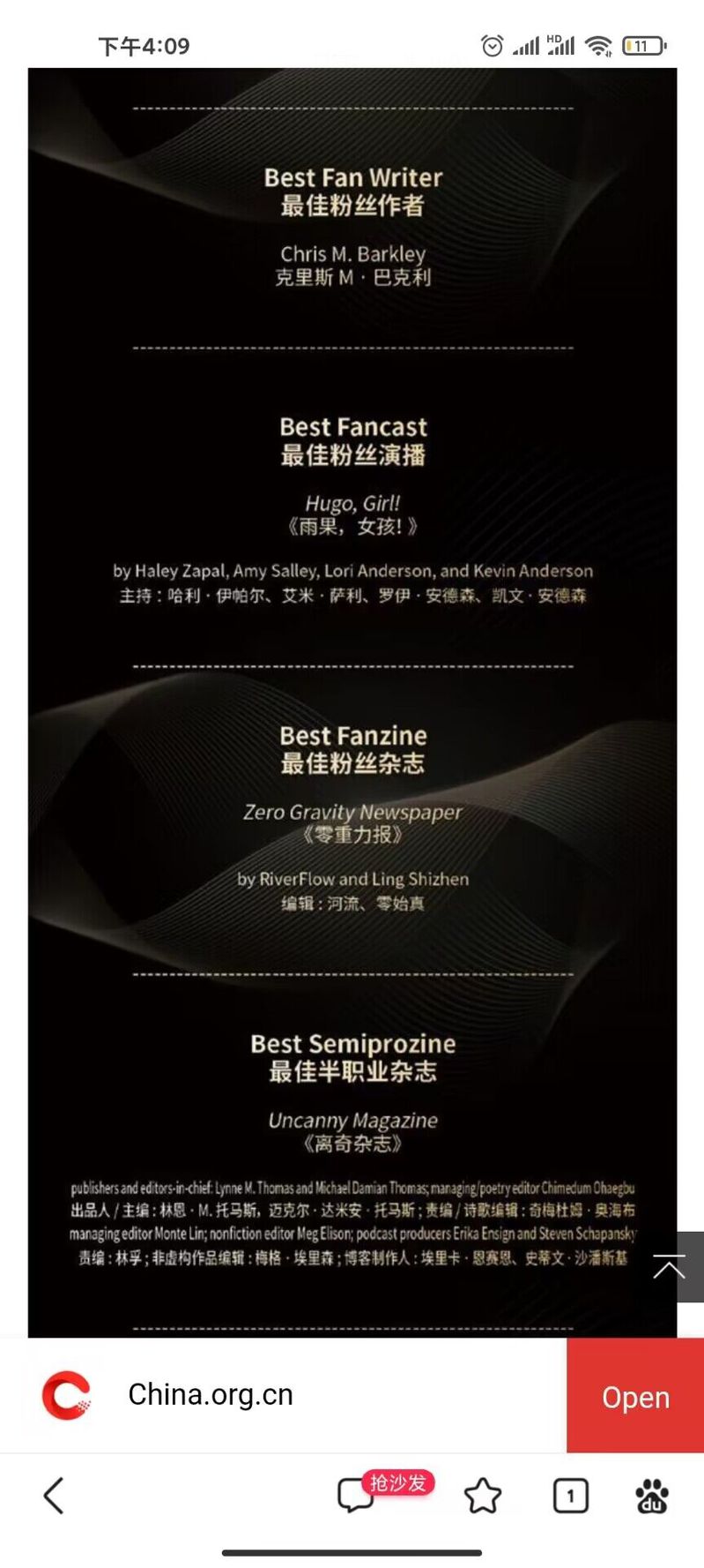 2023年第81届世界科幻大会于10月18日至22日在成都科学馆举行,世界科幻大会由世界科幻协会主办,是全球最受瞩目、历史最悠久、规模和影响力最大的科幻文化主题活动,2023年首次在中国举办。此次大会评选出17个雨果奖奖项和惊奇奖、北极星奖等荣誉,如意体育(中国)人文学部中文专业2205班学生温卓峰主编的科幻杂志《零重力报》获得“最佳粉丝杂志”的荣誉称号,《人民日报》、中国网、央视网等多家媒体杂志都进行相应报道。http://m.app.china.com.cn/english/template/displayTemplate/news/newsDetail/9000050/116765845.html?isShare=true